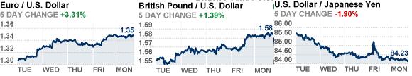 Австралийский доллар торгуется в области 2-х летнего максимума против доллара после того, как индекс от Credit Suisse Group AG, основанный на своп-ценах, оценил в 66% вероятность того, что РБА повысит учетную ставку на заседании, которое состоится на следующей неделе. Ранее доллар сдал позиции основных контрвалют в связи со спекуляциями вокруг дополнительных мер монетарного стимулирования со стороны ФРС, что подавляло спрос на активы США. Иена сдала позиции против доллара поскольку отчет показал признаки ухудшения в бизнес-климате Японии. Участники рынка ожидают, что на текущей неделе Ирландия раскроет информацию относительно поддержки проблемного банка Anglo Irish Bank Corp. На прошлой неделе министр финансов Ирландии Ленихэн сообщил, что затраты на спасение Anglo Irish будут контролируемыми и составят 22 млрд евро. Однако многие аналитики наводят другую цифру - 35 млрд евро. Информация по данному вопросу ожидается в пятницу. "История с кредитными рисками в банковской системе ЕС ухудшается," говорит Себастьян Гали, валютный стратег в BNP Paribas SA. "Многочисленные косвенные факторы говорят об нестабильности."