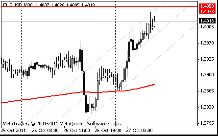 Что касается возможных действий ФРС, в понедельник заместитель главы ФРС Дадли заявил, что "мы четко обозначили наш интерес к поддержке ипотечного рынка". Так что объявление 2 ноября о покупке на баланс ФРС двух-трех сотен миллиардов долларов можно считать гарантированным. И после закрытия рынками темы европейского долгового кризиса в ближайшие дни отрабатываться будет тема третьего раунда количественного смягчения. Поэтому, даже после прошедшего сильного роста, евро может на ожиданиях QE-3 взлететь и до $1.45. Сегодня пара евро/доллар преодолела уровень $1.4080/90 - МА100 и МА200 для временного промежутка D1.