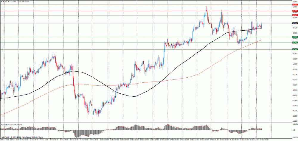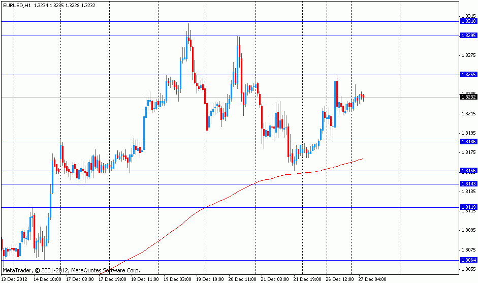 В США Белый дом и Конгресс так еще и не достигли прогресса в деле предотвращения "бюджетного обрыва", представляющего собой сочетание повышения налогов и сокращения расходов, который грозит стране с 1 января. Президент Обама в пятницу вернется с каникул, проведенных на Гавайях, но рынки не слишком надеятся на то, что будет достигнуто соглашение. Кроме того, к понедельнику будет достигнут верхний предел государственных заимствований США, составляющий 16,394 трлн долларов. Это повлечет за собой ряд чрезвычайных мер, которые могут купить правительству время до февраля или марта, прежде чем оно окажется пред лицом полномасштабного долгового кризиса.