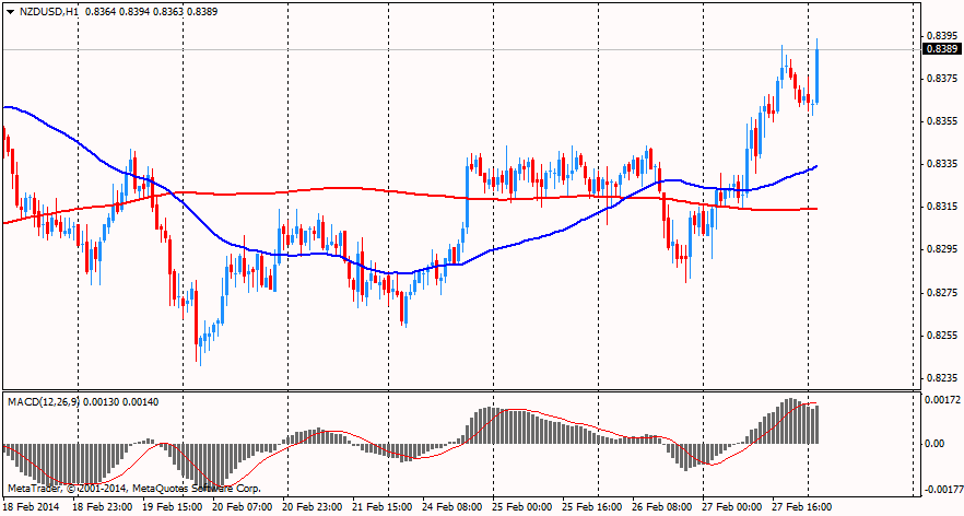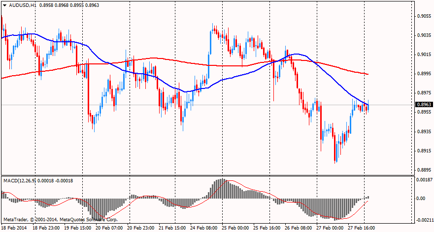 Австралийская валюта вначале вчерашней сессии упала после выхода данных объёма капитальных вложений в Австралии за четвёртый квартал 2013 г. который снизился на 0,7%, а с сезонной коррекцией — снизился на 5,2%, тогда как аналитики ожидали снижения всего на -1%. Отметим, что предыдущее значение показывало рост показателя на 3.6%. Данное падение оказалось самым масштабным с сентября 2009 года. Однако после выхода негативных данных по США валюта восстановила свои позиции и вернулась к максимумам вчерашней сессии.