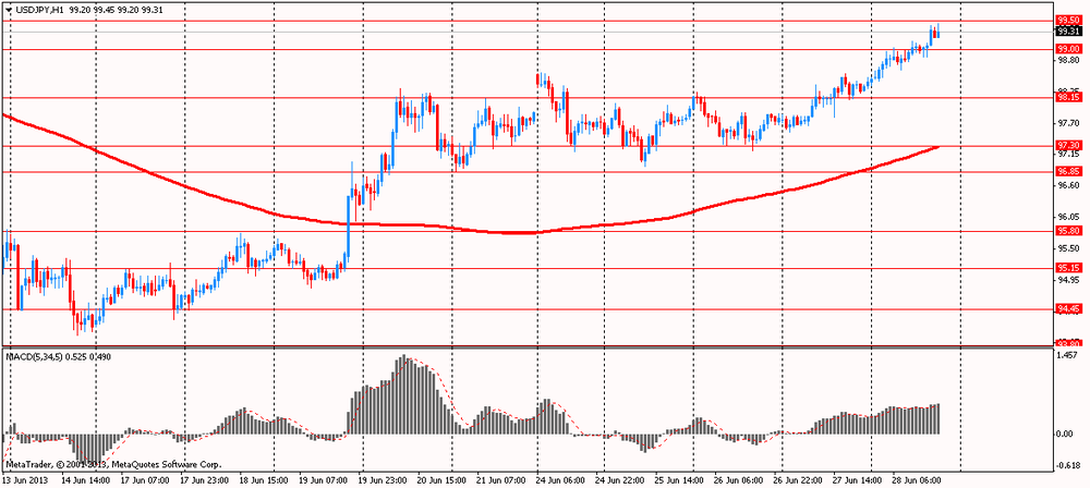 Превысившие прогнозы данные по промпроизводству за май вкупе с неоднозначными результатами инфляционного отчета развили бычий моментум в паре с самого утра, после чего кросс получил поддержку от статистики из США. По мнению Дерека Халпени из BTMU, «очевидность того, что Абэномика оказывает влияние на реальную экономику, поддержит акции и будет способствовать ослаблению иены. Прорыв выше Y100.00 вероятен, но все решит статистика из США, заявленная на следующую неделю.