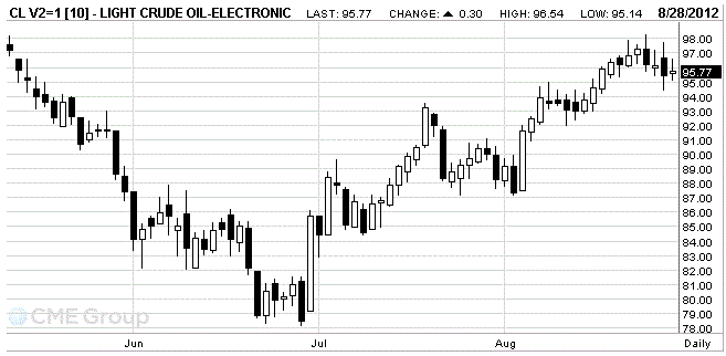 Стоимость октябрьских фьючерсов на американскую легкую нефть марки WTI (Light Sweet Crude Oil) на NYMEX сейчас составляет $95,85 за баррель.