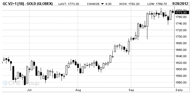 Стоимость октябрьского фьючерса на золото на COMEX сейчас составляет 1773.30 доллара за унцию.