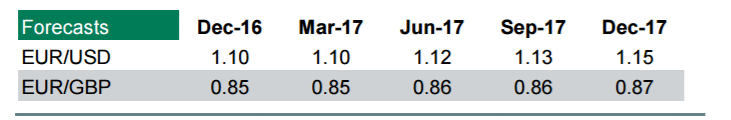 "На наш взгляд, есть два ключевых фактора, которые будут влиять на перспективы евро. Первым из них является риск для ближайших перспектив роста в еврозоне, вытекающих из возрождающихся политических рисков и сохраняющейся слабости в банковском секторе. Мы ожидаем, что эти риски усилятся в преддверии итальянского конституционного референдума в ноябре, голландских всеобщих выборов в марте следующего года, выборов президента Франции в апреле следующего года и в мае, и немецких всеобщих выборов в сентябре 2017 года. Такие риски могли бы добавится к экономических "встречным ветрам" для экономики еврозоны, что потребует от ЕЦБ дальнейшего смягчения политики уже в декабре. В то время как эти события будут негативными для единой валюты в ближайшее время, мы сомневаемся, что эти риски будут представлять существенную угрозу для евро в 2017 году. Вторым фактором для евро будут убывающие перспективы агрессивного смягчения политики ЕЦБ. В частности, Совет управляющих ЦБ будет иметь дело с проблемами, такими как дефицит активов и плоская кривая доходности. Мы ожидаем, что в декабре этого года ЕЦБ объявит о дополнительных мерах, которые позволят продлить срок действия своей программы покупки активов. Однако, мы сомневаемся, что ЦБ будет в состоянии продолжать покупать EGBs нынешними темпами в 2017 году. В результате, в следующем году могут усилится ожидания сокращения объема программы QE. Все это, скорее всего, сделает евро менее привлекательной валютой фондирования и поможет поднять длинный конец кривой доходности по отношению к остальной части G10. В целом, прогноз для евро на ближайшие 3-6 месяцев должен оставаться достаточно сбалансированным, с возможностью небольшого снижения, учитывая сочетание противоречивых драйверов - политических и экономических рисков, с одной стороны, и постепенное истощение денежного арсенала ЕЦБ с другой стороны. Принимая во внимание все эти факторы, мы пересмотрели наши долгосрочные прогнозы в сторону роста - теперь мы ожидаем, что пара EUR/USD достигнет $1,15 в конце 2017 года", - заявили эксперты.
