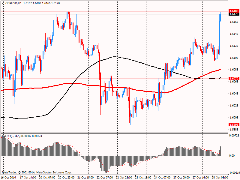Фунт продолжил свое повышение против доллара, приблизившись при этом к недельному максимуму на фоне публикации разочаровывающих отчетов по США. Немного подняли рыночные настроения результаты стресс-тестов европейских банков, опубликованные в минувшие выходные. Между тем, поддержку фунту по-прежнему оказывают позитивные данные по экономическому росту Великобритании, представленные в пятницу. Напомним, ВВП Великобритании вырос в третьем квартале на 0,7% (в соответствии с прогнозами) после 0,9% за три месяца по июнь. В годовом исчислении ВВП вырос на 3%, как и прогнозировалось, по сравнению с годовым ростом во втором квартале на 3,2%. Доминирующий сектор услуг Великобритании по-прежнему оказывает максимальную поддержку росту, за которым следует производственный сектор. Данные подчеркнули ожидания, что уверенное восстановление может вынудить Банк Англии повысить ставки в начале 2015 года.