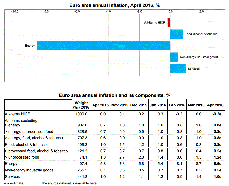 Кроме того, в Евростат сообщили, что потребительские цены в еврозоне упали в апреле на 0,2% после нулевого изменения в прошлом месяце. Эксперты ожидали, что цены снизятся лишь на 0,1%. Тем временем, базовый индекс потребительских цен, в котором не учитываются волатильные цены на энергию и продукты питания, вырос в апреле на 0,8%, что оказалось меньше ожиданий аналитиков (+0,9%). В марте данный показатель повысился на 1,0%.