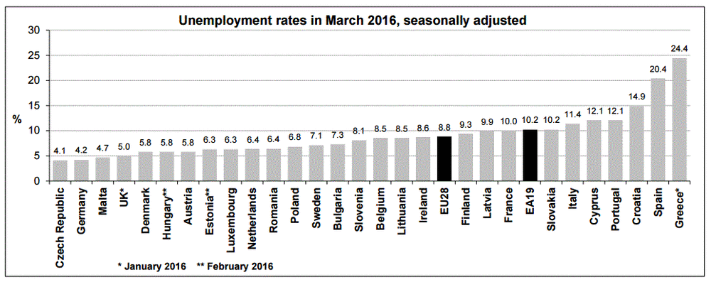 Еще один отчет показал, что в марте уровень безработицы в еврозоне уменьшился до 10,2% с 10,4% в феврале (пересмотрено с 10,3%). Последнее значение оказалось наименьшим с августа 2011 года. Эксперты ожидали, что уровень безработицы составит 10,3%. Среди 28 стран ЕС уровень безработицы в марте снизился до 8,8% (минимум с апреля 2009 года) с 8,9% в феврале.