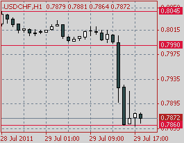 Доллар стремительно пошел вниз после выхода данных: USD/CHF рухнул к новым историческим минимума на Chf0.7910, а USD/JPY - упал к Y77.11.