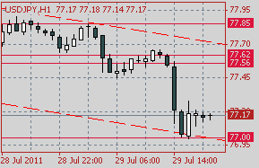 USD/JPY снижается и сейчас торгуется в районе Y77.55. Ближайшие ордера на покупку расположены в зоне Y77.35/30. Опционный барьер находится на Y77.25. Далее опционы и стопы размещаются на Y77.00.