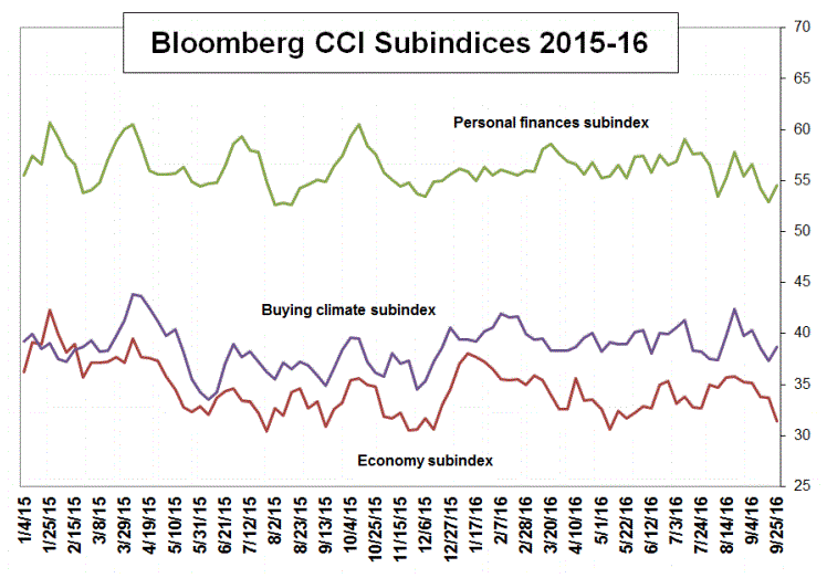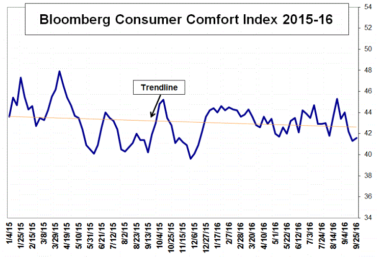 Согласно данным, за неделю, завершившуюся 25 сентября, индекс потребительского комфорта поднялся до 41,6 пункта с 41,3 пункта неделей ранее (по 18 сентября). Несмотря на улучшение, показатель по-прежнему остается ниже среднего значения 2016 года (43,4 пункта). Долгосрочное среднее значение, которое рассчитывается с конца 1985 года, составляет 41,7 пункта.