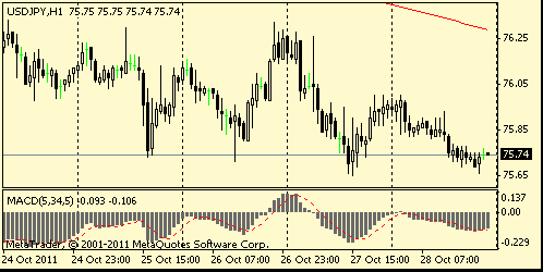 По итогам сессии большая часть американских акций упали после вчерашнего динамичного роста. Эйфория после второго саммита ЕС сменилась осторожностью по поводу возможности реализации достигнутых соглашений. Оптимизм инвесторов пошатнули неудовлетворительные результаты аукциона итальянских долговых бумаг - впервые за время существования евро стоимость 10-летних заимствований для Италии превысила 6%-ный порог. Вышедшие сегодня макроданные США свидетельствуют о некотором потеплении потребительских настроений. В октябре индекс потребительского доверия повысился сильнее ожиданий, и рост личных расходов ускорился в сентябре, составив 0,6% м/м. Наряду с этим личные доходы повысились в сентябре лишь на 0,1% м/м (прогнозировалось +0,3% м/м), и при высокой безработице устойчивость потребительских расходов ставится под сомнение.