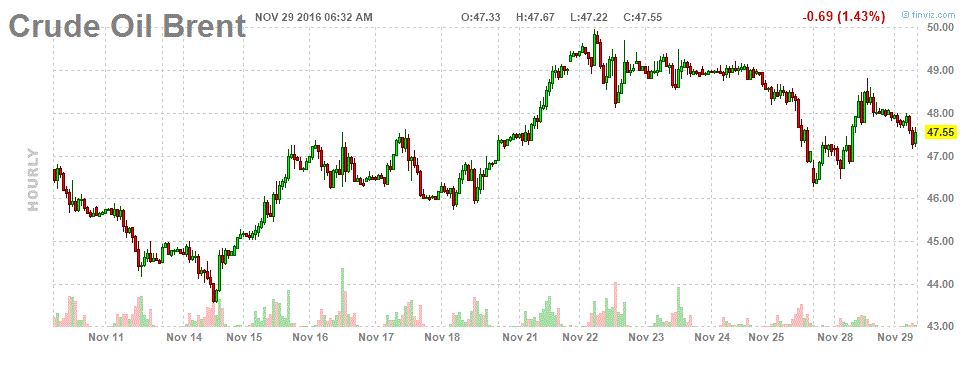 Цены на нефть в понедельник колебались. К настоящему моменту цены выросли примерно на 2%, в то время как инвесторы оценивают возможность достижения соглашения ОПЕК относительно ограничения добычи в преддверии заседания в среду. Сокращение нефтедобычи, вероятно, окажет поддержку ценам и вызовет рост валют стран-экспортеров нефти, таких как канадский доллар, российский рубль и норвежская крона. "Все внимание будет направлено на заседание ОПЕК на этой неделе, инвесторы хотят понять, насколько может быть сокращена нефтедобыча", - говорит Бред Бечтел, валютный стратег-аналитик Jefferies Group.