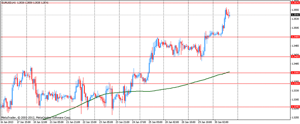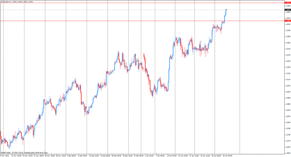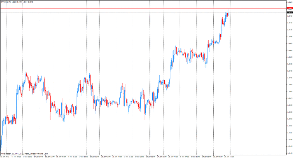 Первая рекаций рынков на отчет по ВВП была сдержанно-разочарованной, что вынудило пару EUR/USD консолидироваться в области $1.3550. Однако вскоре курс EUR/USD продолжил рост, и сейчас пара тестирует сопротивление $1.3575.