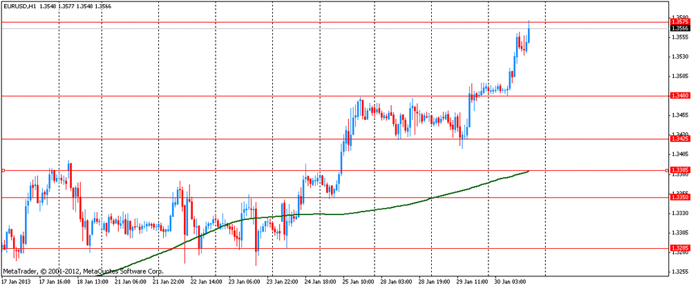 От существенных продаж участников рынка пока удерживают ожидания оглашения итогов текущего заседания Комитета по открытым рынка ФРС. Учитывая данные по ВВП, на рынке выросли ожидания того, что федрезерв подтвердит намерения придерживаться сверхмягкой денежной политики до улучшения ситуации с безработицей. Оглашение итогов заседания Комитета по открытым рынка ФРС намечено на 19:15 GMT.