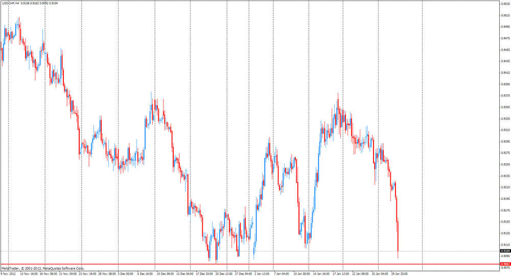 Индексы находятся в небольшом минусе. Давление на индексы оказывают вышедшие перед началом сегодняшних торгов макроэкономические данные, которые зафиксировали неожиданное снижение ВВП США в 4-м квартале. Согласно предварительной оценке, ВВП США по итогам последних 3-х месяцев 2012 года упал на 0,1%. Средний прогноз аналитиков подразумевал рост на 1,3% после повышения на 3,1% в предыдущем отчетном периоде.