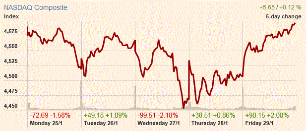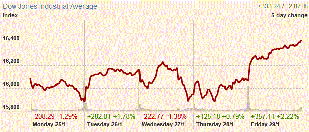 В пятницу основные фондовые индексы Уолл-стрит выросли более чем на 2% после того как слабые данные по ВВП повысили ожидания, что Федеральная резервная система США не будет спешить с повышением процентных ставок. Экономика США замедлилась в последние месяцы 2015 года, это знак ослабления импульса в условиях слабости мировой экономики и потрясений на финансовых рынках. Валовой внутренний продукт расширился на 0,7% в годовом исчислении в четвертом квартале. Экономика выросла на 2% в третьем квартале и на 3,9% во втором квартале. Экономисты ожидали рост ВВП на 0,8% темп в промежуток с октября по декабрь.