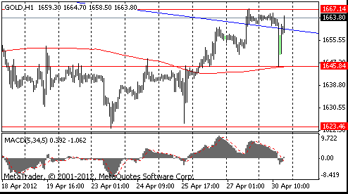 Тем не менее, золото вернуло утраченные позиции позже на фоне роста ожиданий относительно нового раунда количественного смягчения в США после того, как индекс менеджеров по закупкам Чикаго, который в апреле упал до минимального уровня с ноября 2009 года.