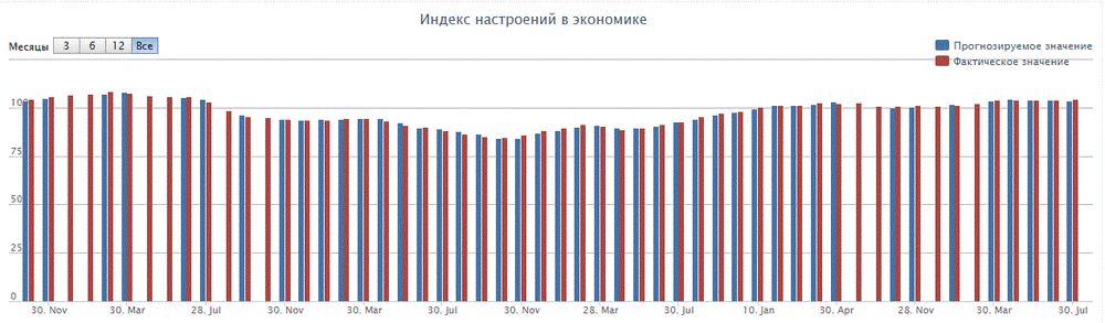 Индикатор потребительской уверенности поднялся до -19,0 в июле с -20 в предыдущем месяце. Напомним, в мае показатель составлял -19,7. Положительный вклад в рост потребительской уверенности отмечался со стороны компонентов, отвечающих за перспективы безработицы, финансовой ситуации домашних хозяйств и экономической ситуации в стране, сообщили в агентстве. Также стало известно, что индекс общих экономических настроений вырос в пятый месяц подряд - до 1,4 против 1,3 в июне.