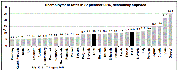 Между тем, другой отчет показал, что по итогам сентября уровень безработицы в еврозоне уменьшился до 10,8% с 10,9% в августе (пересмотрено с 11,0%). Последнее значение оказалось наименьшим с января 2012 года. Напомним, в сентябре 2014 года безработица составляла 11,5%. Эксперты ожидали, что уровень безработицы останется без изменений. Между тем, стало известно, что среди 28 стран ЕС уровень безработицы в сентябре составил 9,3% по сравнению с 9,4% в августе. В соответствующем месяце прошлого года безработица была на уровне 10,1%.