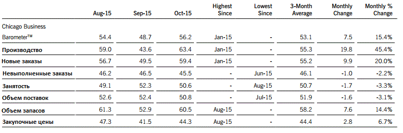Согласно данным, октябрьский индекс менеджеров по закупкам Чикаго вырос до уровня 56,2 пункта против 48,7 пункта в сентябре. Последнее значение оказалось наибольшим с января. Аналитики полагали, что показатель поднимется лишь до 49,0 пункта. Напомним, что индекс представляет собой результаты опроса менеджеров по закупкам в сфере промышленности из Чикаго. Этот индекс затрагивает состояние производственных заказов, цен на производимую продукцию и товарных запасов на складах. Значение ниже уровня 50 пунктов являются индикатором замедления темпов развития экономики. За данным индексом пристально наблюдают, так как он публикуется незадолго до выхода индекса деловой активности от Института Управления поставками (ISM) и может давать представление о том, каким выйдет индикатор деловой активности на национальном уровне.