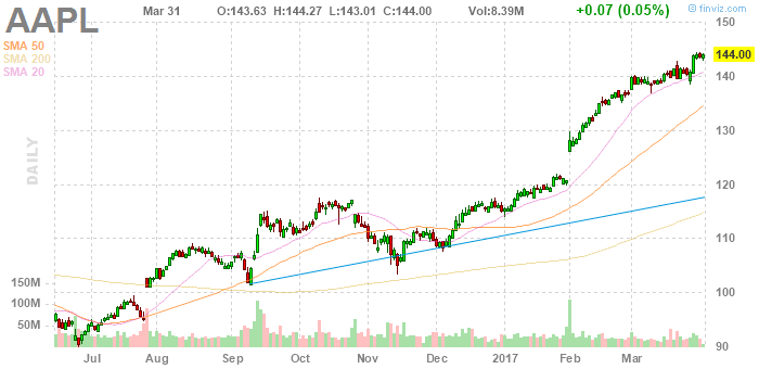 За последние три месяца Apple дул попутный ветер, но акции могут столкнуться с трудностями, так как инвесторы стремятся получить больше прибыли. Одной из основных причин недавнего подъема Apple стали ожидания запуска iPhone в 10-ю годовщину Apple. Но войны смартфонов накаляются, а Samsung Electronics Co. выпустила свой новейший флагманский телефон Galaxy S8, который на этой неделе получил сильные отзывы.