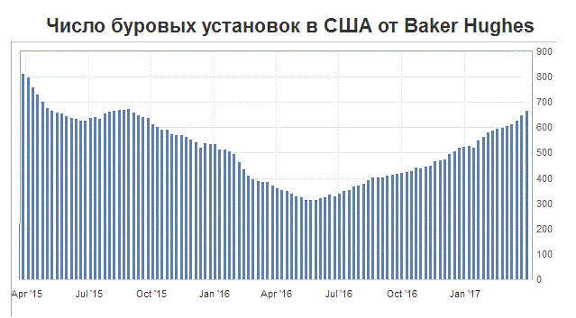 Отчет нефтесервисной компании Baker Hughes показал: с 25 по 31 марта количество активных буровых установок по добыче нефти в США выросло до 662 единицы с 652 единицы. Последнее значение является самым высоким с начала сентября 2015 года. Кроме того, повышение было зафиксировано в 11 раз подряд. Количество установок по добыче газа увеличилось на 5 единиц, составив 160 единиц. Тем временем, общее число буровых установок (газовых и нефтяных) повысилось на 15 единиц, до уровня 824 единиц.