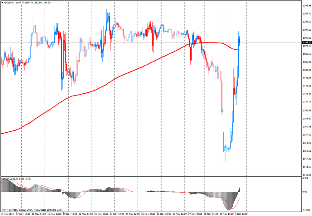 Золото торгуется с повышением на 1.58%, у отметки $1194. Металл восстановился от дневного минимума $1141.80 больше чем на $50. Сегодняшнее восстановление было отчасти обусловлено ослаблением доллара США и слабыми данными PMI из Китая и еврозоны. Кроме того, агентство Moody's понизило рейтинг Японии. Утром металл открылся с понижением после вчерашнего референдума в Швейцарии.