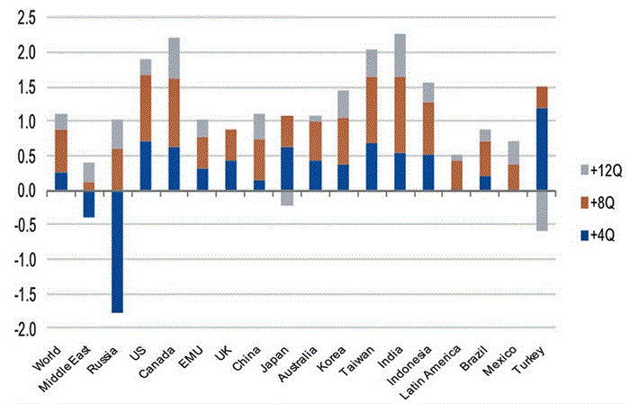 «Как видно из графика, снижение цен на нефть на $20 за баррель добавляет 0.26 п.п. в мировой ВВП после первого года шока, - пишет Маркуссен. - Наиболее болезненно падение цен на нефть отражается на экономике России».