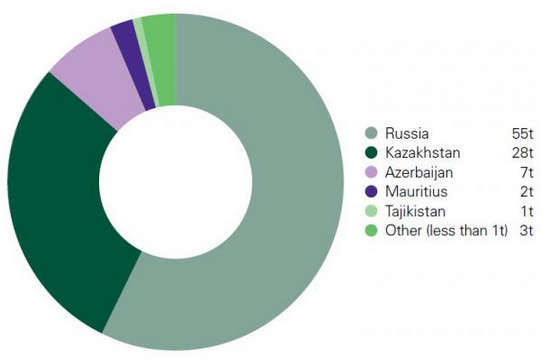 Крупнейшими покупателями золота после России стали другие страны из Содружества Независимых Государств во главе с Казахстаном и Азербайджаном.