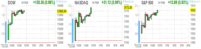 Основные фондовые индексы США второй месяц 2013 года начинают сильным ростом. На текущий момент рост основных индексов составляет почти 1%, при этим индекс DOW показал максимум выше отметки 14000 впервые с октября 2007 года.