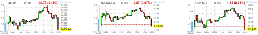 Определенную поддержку индексам оказывала публикация индекса менеджеров по закупкам Чикаго. В феврале индексы вырос до уровня 56.8 пункта против январского значения 55.6 и прогноза 54.1. Более сильные чем ожидалось данный придали индексам импульс, в результате чего индекс DOW обновил исторический максимум. Однако, поддержка была временной и индексы отступили.