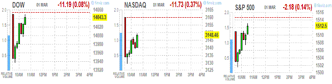 Опасения относительно влияния секвестра бюджета на ситуация в американской экономике, а также слабые макроэкономические данные стали причиной негативного старта торгов на основных фондовых площадках США в первую торговую сессию марта.