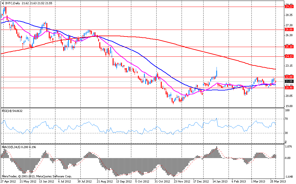 S&P 500 1,560.62 -8.57 -0.55%В данный момент акции INTC торгуются по $21,55 (-1,27%).