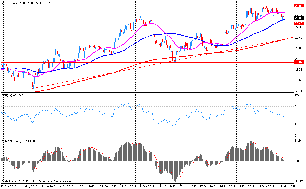 В данный момент акции GE торгуются по $23.01 (-0.50%), тестируя поддержку в области $23.00 (МА(50) для D1, минимум марта и второй половины февраля). Ниже поддержкой является область $22,60 (максимум января и первой половины февраля).