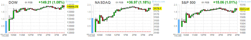 Основные фондовые индексы США второй месяц 2013 года начинают сильным ростом. На момент закрытия рост основных индексов составляет более 1%, при этим индекс DOW показал максимум выше отметки 14000 впервые с октября 2007 года.
