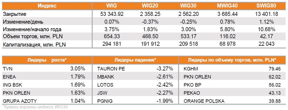 Индекс наиболее ликвидных бумаг WIG30 в отличие от индекса широкого рынка завершил сессию с понижением, потеряв 0.25%. Только треть бумаг индексной корзины закончили день ростом котировок. С наилучшим результатом закрылся TVN (WSE: TVN), акции которого подорожали на 3.05%. В тоже время среди наиболее просевших акций оказались TAURONPE (WSE: TPE) и MBANK (WSE: MBK), упавшие на 3.27% и 2.61% соответственно.