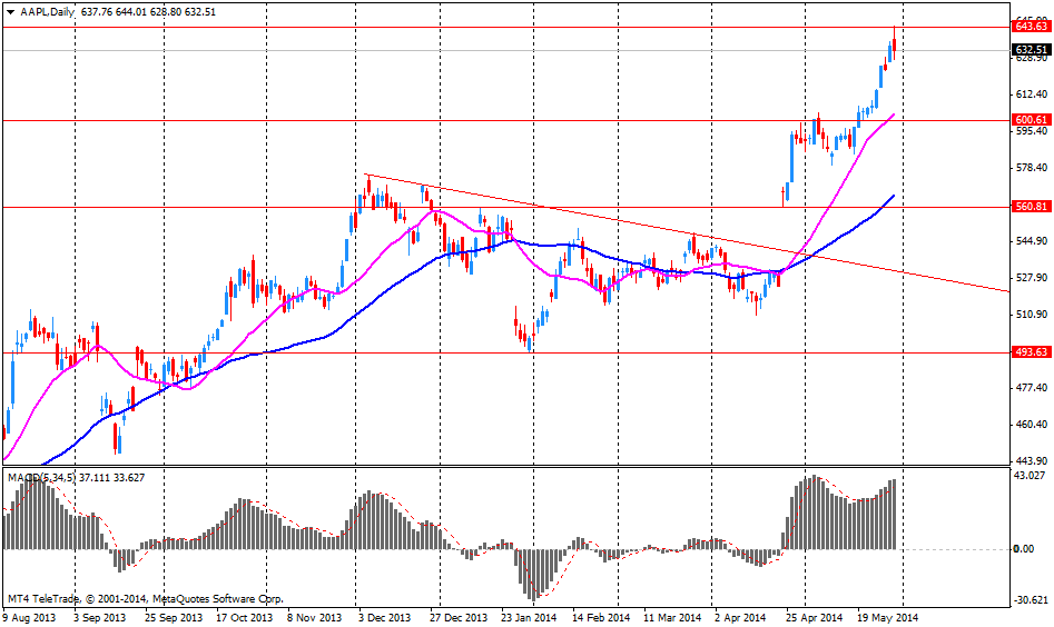 В течении сегодняшней сессии могут активно торговаться акции компании Apple (AAPL), которая планирует представить новые продукты в рамках конференции разработчиков WWDC, начинающейся сегодня в Сан-Франциско. Apple, как ожидается, представит новые версии операционных систем для ПК и мобильных устройств. Что касается устройств, то не исключено обновление плашета iPad, ноутбуков и ПК. Также возможно, сегодня Apple анонсирует смартфон iPhone 6 и «умные» часы iWatch. Начало презентации Apple намечено на 17:00 GMT.