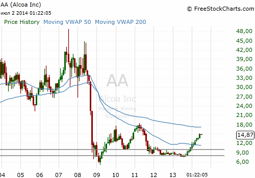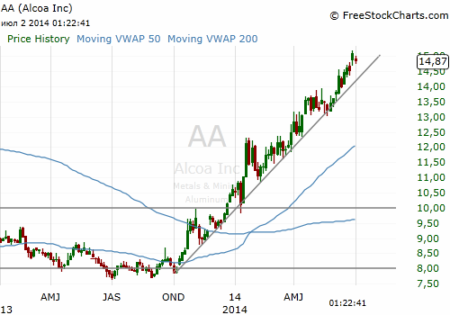 На текущий момент акции Alcoa (АА) котируются по $14.87 (+0,47%)