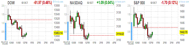 В составе индекса DOW большинство компонентов снижаются. Самое крупное снижение наблюдается в секторе конгломератов (-0,6%). Лидерами снижения являются Impac Mortgage Holdings Inc. (+22,92%), UQM Technologies Inc. (19,30%).