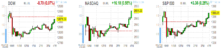 Начав сессию в небольшом минусе, основные фондовые индексы США позже резко снизились после того, как опубликованная статистика зафиксировала снижение индекса деловой активности в производственном секторе США от ISM ниже отметки 50 пунктов впервые с августа 2009 года. По итогам июня значение индекса составило 49,7 пункта при прогнозе 52,1 и значении за май 53,5 пункта. Тем не менее, столь сильное снижение важного показателя было несколько нивелировано вышедшими параллельно данными по расходам на строительство, которые по итогам мая выросли на 0,9% при прогнозе +0,3%.