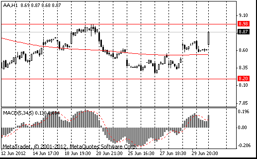 На текущий момент акции AA выросли в цене до уровня $8.87 (+2.84%). Поддержку акциям оказывает рост цен на сырьевые товары.
