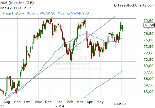 На текущий момент акции Nike (NKE) котируются по $78.47 (+0,87%)