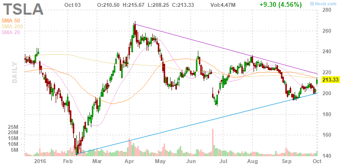 На текущий момент акции Tesla Motors (TSLA) котируются по $213,33 (+4,56%)