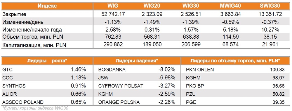 Котировки бумаг большинства компаний из корзины WIG30 претерпели снижение. При этом больше всего в своей капитализации потеряли угольные компании BOGDANKA (WSE: LWB) и JSW (WSE: JSW) - «-8.02%» и «-6.98%» соответственно. Причиной обвала угольщиков стало сообщение BOGDANKA о том, что объем добычи угля компанией в 2015 году может составить менее 10 млн. т, так существуют проблемы со сбытом продукции.