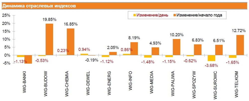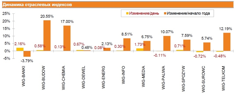 Отраслевые индикаторы демонстрировали преимущественно рост. Противоположные тенденции наблюдались только в сырьевом и телекоммуникационном секторах, а также топливной промышленности. Индексы, представляющие данные отрасли, WIG-SUROWC, WIG-TELKOM и WIG-PALIWA, потеряли 0.72%, 0.48% и 0.11% соответственно. В тоже время лучший результат по итогам дня зафиксировали индикатор банковского сектора WIG-BANKI (+2.16%) и индекс медиа-сектора WIG-MEDIA (+1.73%).