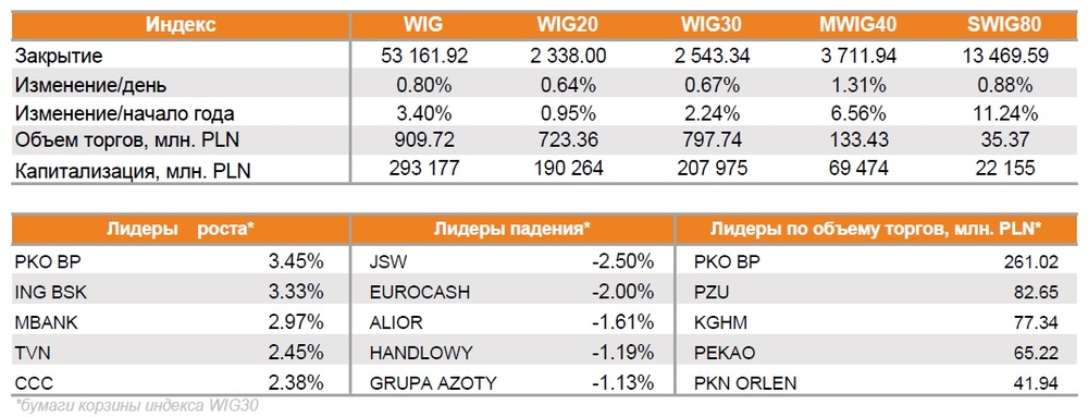 Индекс наиболее ликвидных акций WIG30 в свою очередь поднялся на 0.67%. Среди бумаг индексной корзины заметнее всего подорожали акции банковских учреждений - PKO BP (WSE: PKO) на 3.45%, ING BSK (WSE: ING) на 3.33% и MBANK (WSE: MBK) на 2.97%. В тоже время в числе наиболее подешевевших оказались акции JSW (WSE: JSW) и EUROCASH (WSE: EUR), потерявшие 2.5% и 2% соответственно.