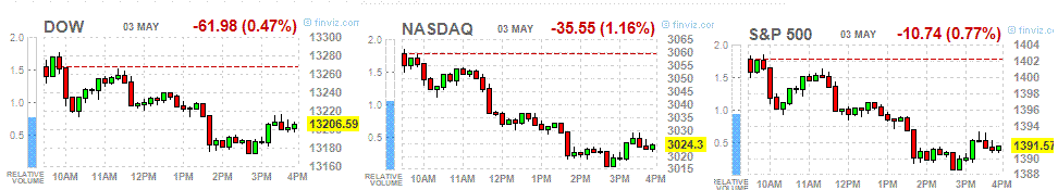 Нисхождение индексов продолжается уже третий день кряду, и основной темой пока остается состояние американского рынка труда. На днях разочаровывал индикатор занятости ADP, а сегодня негативом для участников торгов стали ключевые данные по занятости в несельскохозяйственных отраслях за апрель - показатель увеличился на 115 тыс, т.е. еще слабее, чем месяцем ранее, и существенно слабее средних ожиданий. Занятость в обрабатывающей промышленности выросла лишь на 16 тыс по сравнению с 37 тыс месяцем ранее. Средняя почасовая зарплата в апреле стагнировала (нулевое изменение после роста на 0,2% месяцем ранее), а уровень безработицы снизился с 8,2% до 8,1%, однако в силу особенности расчетной формулы показателя само по себе это снижение далеко не всегда свидетельствует об улучшении ситуации на рынке труда - в данном случае такое изменение было связано с банальным сокращением количества людей, ищущих работу.