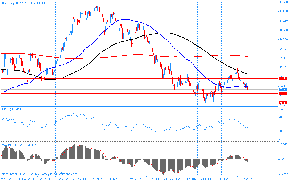 В составе индекса DOW большинство компонентов находятся в минусе. Больше остальных выросли в цене акции Wal-Mart (WMT, +1.21%). Ниже остальных находятся акции Caterpillar Inc. (CAT, -3.26%).