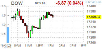 Компоненты индекса DOW торгуются преимущественно в плюсе (19 из 30). Аутсайдером являются акции Caterpillar Inc. (САТ, -1.77%). Больше остальных выросли акции The Procter & Gamble Company (PG, +1.53%).