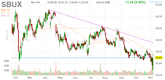 На текущий момент акции Starbucks (SBUX) котируются по $53,01 (+2,40%)